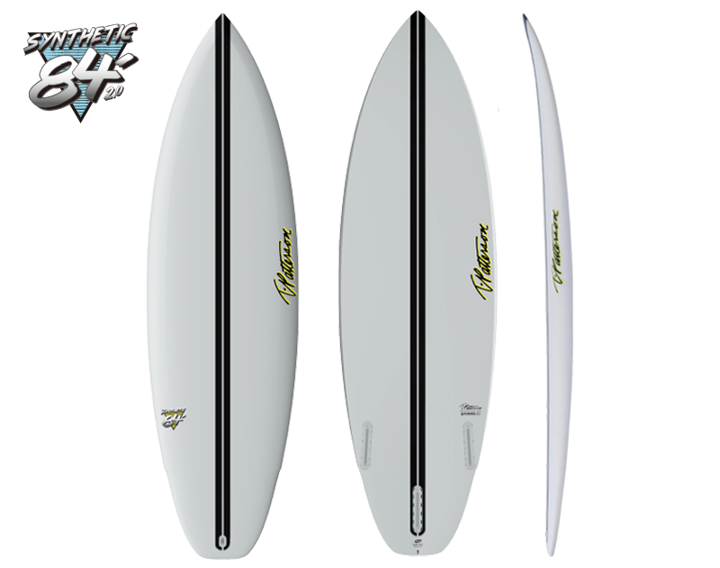 The Synthetic 84 is a tribute to the good old days, when Timmy started his first surfboard label Synthetic surfboards in the 1980’s. Timmy has taken all the positive aspects of boards he built then and has incorporated them into the modern shapes of today. This combo is nothing but pure magic and has been tested by some of the top surfers from around the globe. The consensus of all that have ridden the Synthetic 84’ was nothing but fantastic! As a matter of fact, the “psych meter” went through the roof! The Synthetic 84 has a lower rocker and the bottom runs flat to a slight single into a slight double and fades into vee off the tail. The deck stays flat with a down rail and beak nose. This allows for maximum volume, yet the down rail lets you still sink this higher volume board onto rail in critical sections and off your bottom turns. It has a fuller outline so this board likes to increase your wave count and really comes in handy battling out the every day crowds. You will want to ride this model about 2 inches shorter than your everyday shortboard and comes in a tri fin set up.