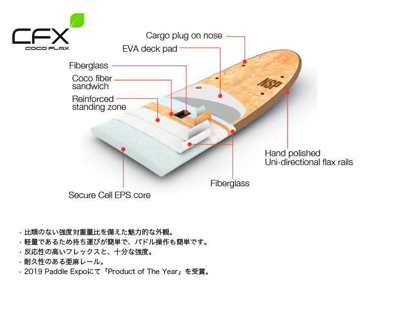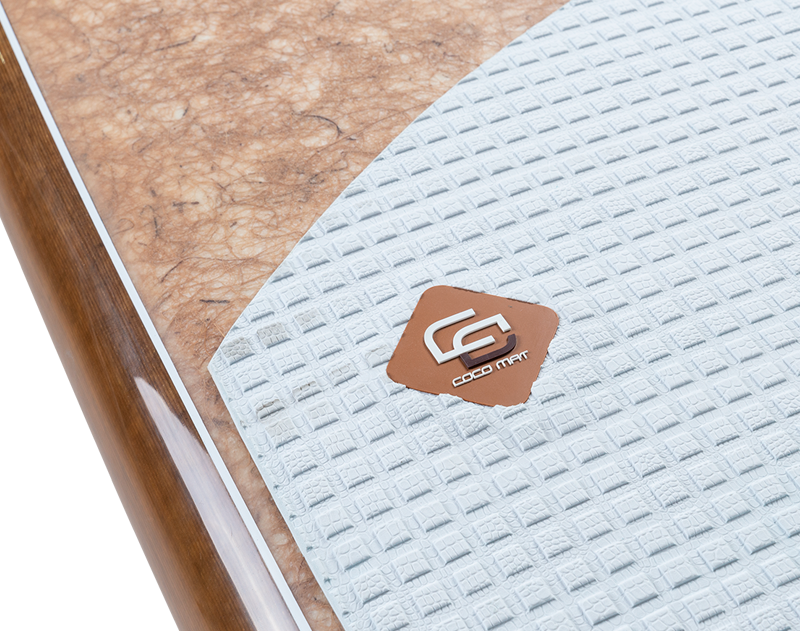 従来のCOCOMAT素材と組み合わせることでガラスクロスとカーボンファイバーをできる限り削減したスーパー・エコなボードがCOCO FLAX。ドイツで開催されたPaddle ExpoにおいてCOCO FLAX ボードは最もエコフレンドリーなボードとして、The Best SUPボードに選ばれるほど世界的に評価が高い工法である。