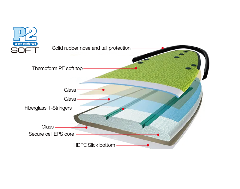 With years of construction refinement and instructor input, The P2 is the perfect fusion of purpose-specific design and construction technology. Unlike usual softboards the P2 is a fully glassed high-quality hard board laminated with soft foam to create the most durable soft board on the market.